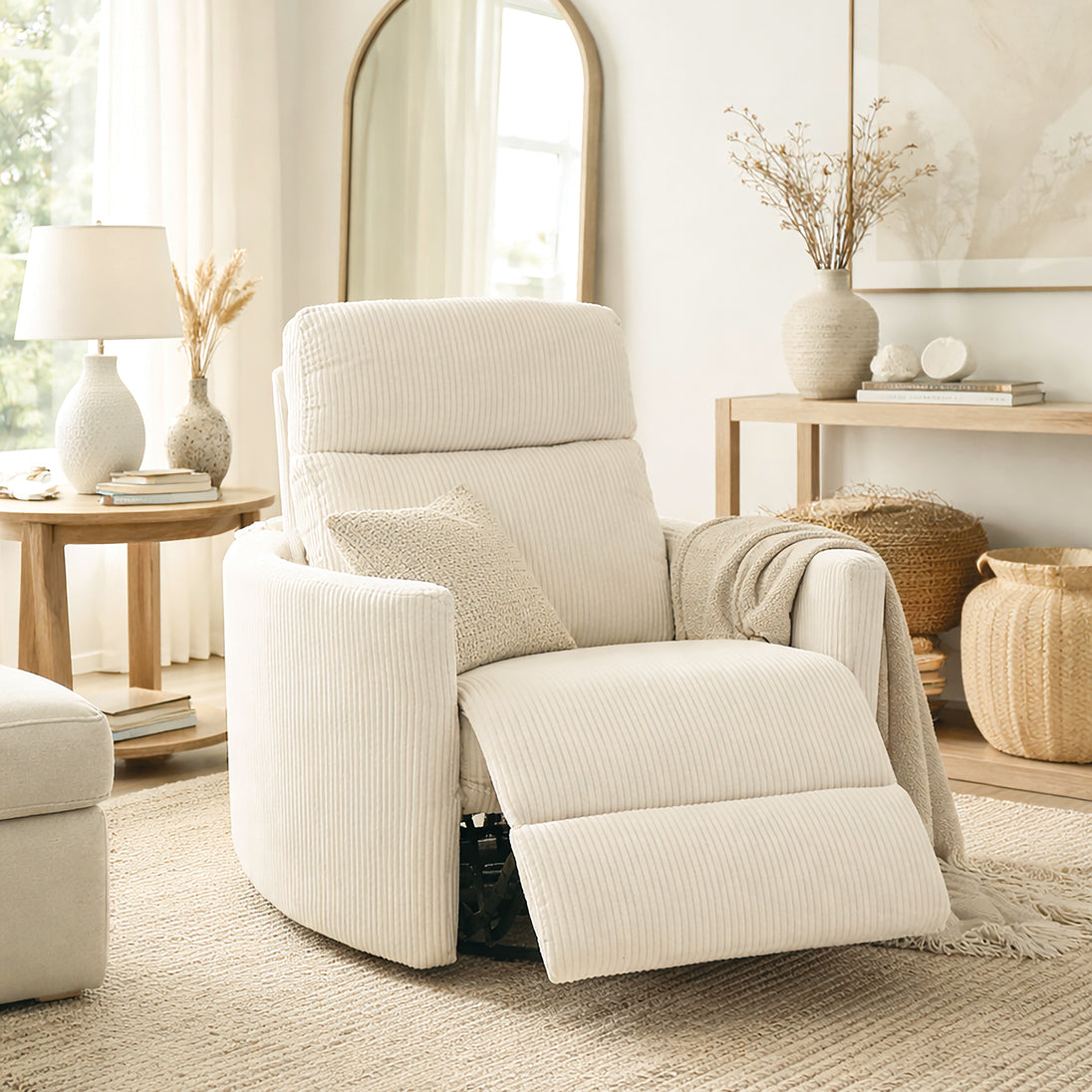 Sink into effortless comfort with this plush, modern reclining electric chair. Upholstered in a soft, textured beige fabric, it features generously padded arms, a supportive high back, and a smooth reclining electric mechanism for laid-back relaxation. The neutral tone blends beautifully with light wood accents and natural décor, making it a perfect fit for cozy living rooms, reading corners, or nursery spaces. Stylish yet inviting, this recliner delivers everyday comfort with a clean, contemporary look.