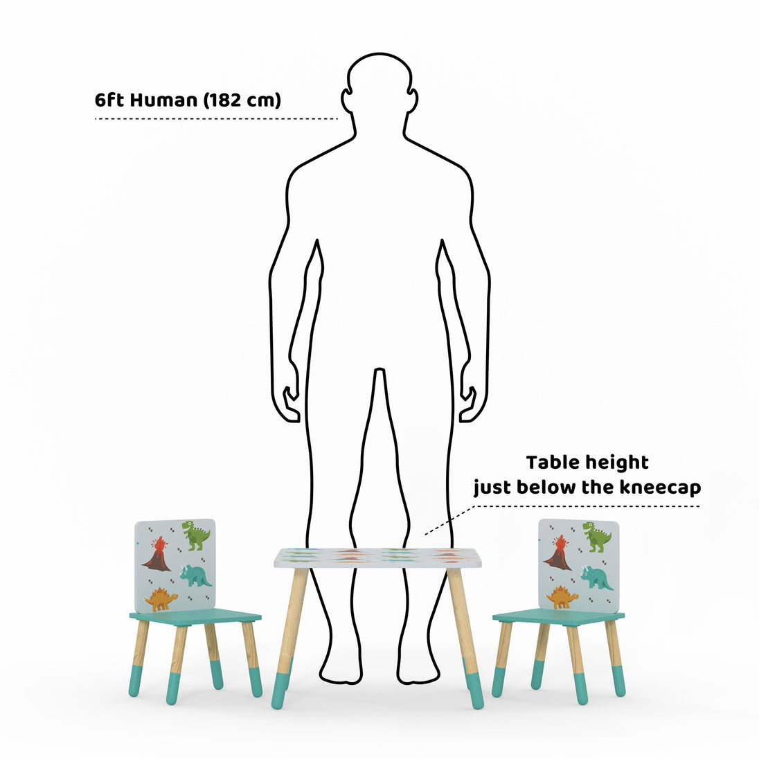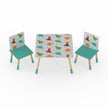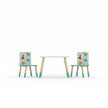 The Dino Table & 2 Chairs is for kids that love to play, read or draw. Featuring high quality digitally printed graphics of your favourite dino characters, Tyrannosaurus Rex, Stegosaurus, Triceratops and an erupting volcano. Fun and colourful, ideal for a kids bedroom, playroom, or wherever your child wants to play. Very easy to assemble, the legs simply screw into the brackets pre-fixed beneath the table top and seat bases. Made using FSC material. Made with a new Scandi design showing pine wooden legs dipped in paint on the ends.
