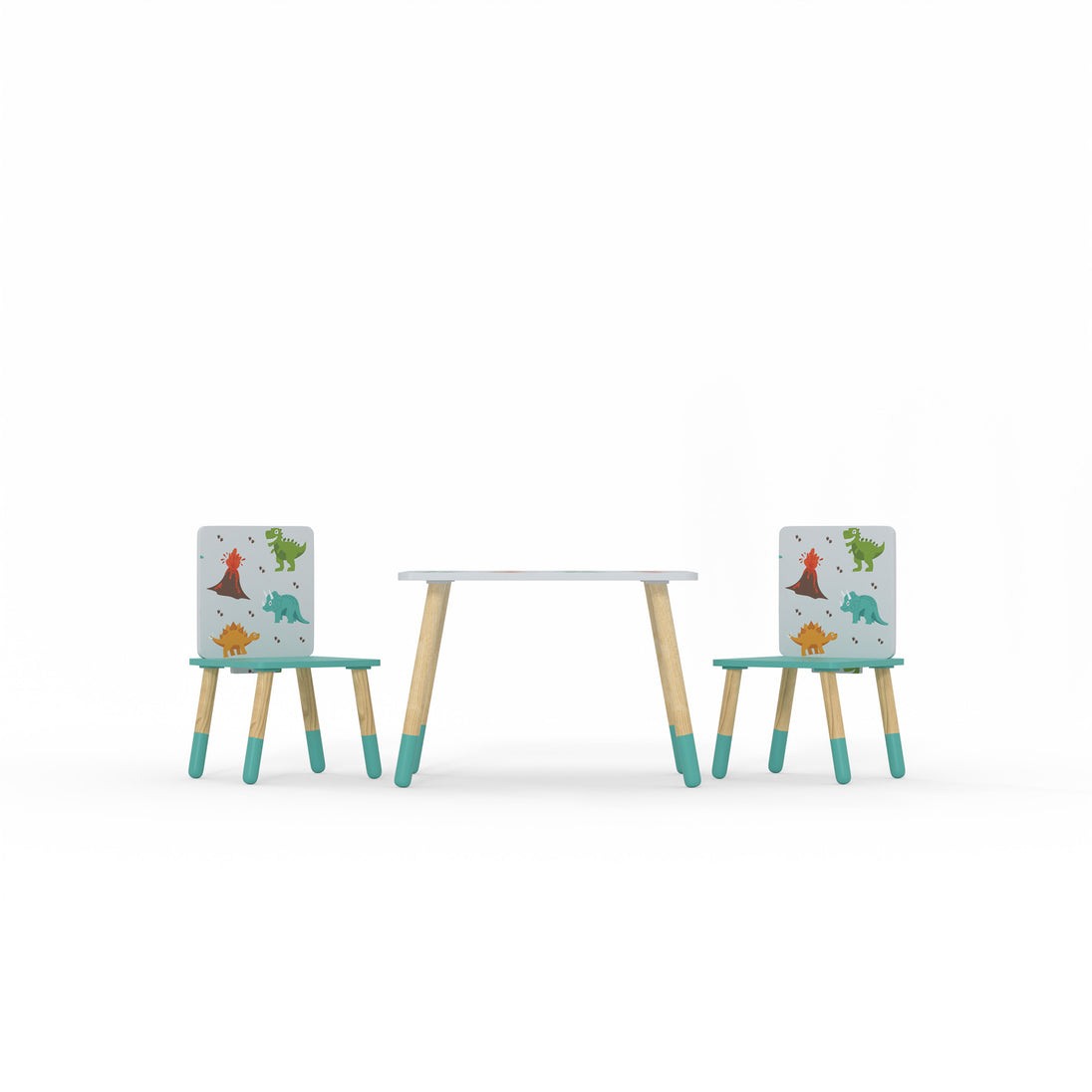 The Dino Table & 2 Chairs is for kids that love to play, read or draw. Featuring high quality digitally printed graphics of your favourite dino characters, Tyrannosaurus Rex, Stegosaurus, Triceratops and an erupting volcano. Fun and colourful, ideal for a kids bedroom, playroom, or wherever your child wants to play. Very easy to assemble, the legs simply screw into the brackets pre-fixed beneath the table top and seat bases. Made using FSC material. Made with a new Scandi design showing pine wooden legs dipped in paint on the ends.