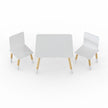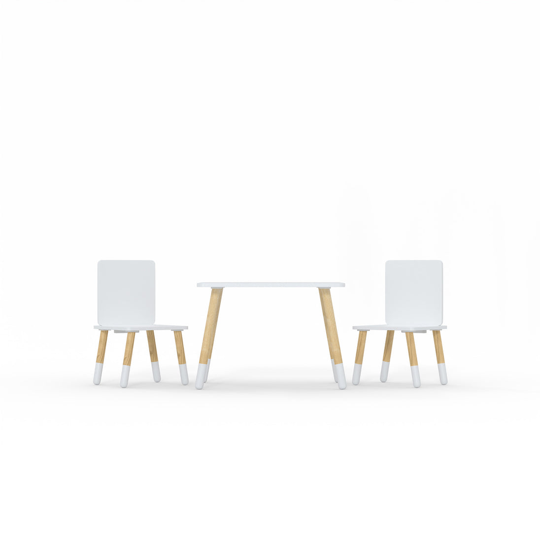 Bring style and functionality to your child's space with this modern 3-piece furniture set. The contemporary design features clean lines and a minimalist white finish that complements any room decor. The set includes a sturdy table and two matching chairs, all supported by natural wood-effect legs with white-dipped ends for an extra touch of charm. The smooth surfaces are easy to wipe clean, making it perfect for various activities from arts and crafts to snack time. The child-sized proportions ensure comfortable seating, while the durable construction stands up to daily use. The versatile design works beautifully in playrooms, bedrooms, or living spaces, providing your little one with their own dedicated spot for creative activities, learning, or meals. The contrasting white and natural wood elements create a sophisticated Scandinavian-inspired look that grows with your child.